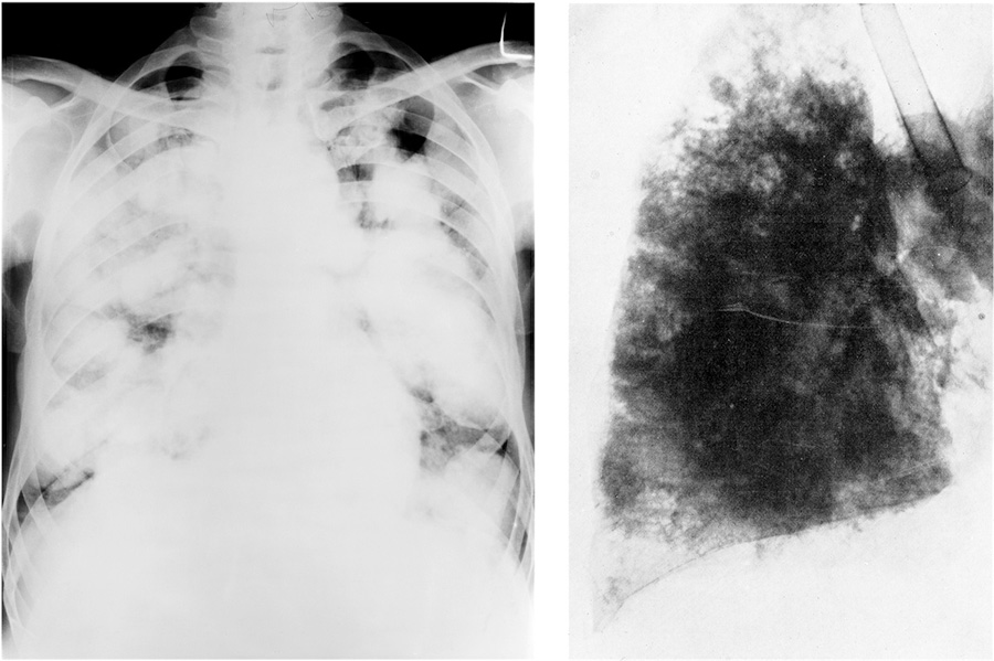 I.1. Слева: Рентгенография грудной клетки, демонстрирующая туберкулез. Справа: Фотография легких пациента после смерти от туберкулеза (1903)