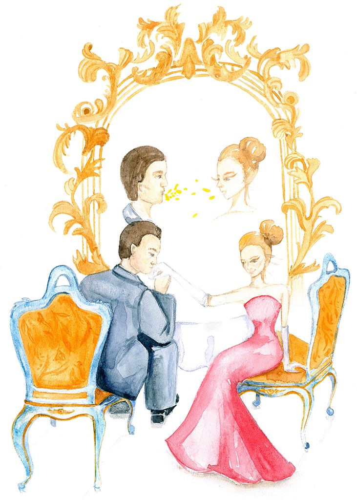 Сам он выглядел подобающе месту и моменту: Ветер, которого я до этого видела только в пляжной одежде или в мотоциклетной амуниции, теперь был одет в белую рубашку и черный костюм-тройку. Мне стало любопытно, как выгляжу я. Благо, рядом с нашим столиком было зеркало чуть ли не во всю стену. Я была в красном облегающем платье с открытыми плечами и в черных перчатках до локтя, волосы собраны в улитку. Кажется, моя фигура стала чересчур уж идеальной, не такой, как в жизни. Интересно, это желание Ветра так повлияло на мой образ или мое собственное?