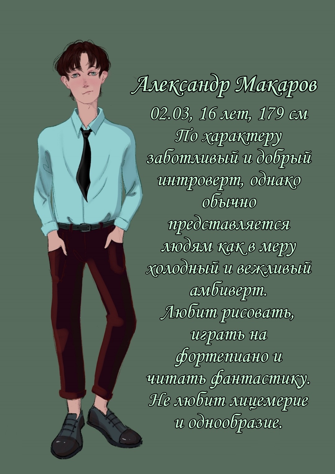 Итак, факт в том, что я очень давно ничего не рассказывал. Хочу повториться, что жизнь моя очень скучна, да и остальные как будто перестали меня замечать в последнее время. Кроме него. Недавно Саша не просто решил подойти, но даже заговорил со мной. Однако ничего хорошего в свой адрес я не услышал. Он положил мне тряпку прямо на учебник и сказал вытереть мел с доски. Безусловно, учебник не выдержал такого к себе отношения, пусть я и быстро убрал источник проблемы. Похоже на то, как на нас влияют остальные, не правда ли? Однако одни изменения могут привести к чему-то хорошему, а другие – к плохому. Но я уже много раз писал об этом, так что не будем заострять на этом внимание. Лучше вернёмся к Александру Макарову. Его вид особо не менялся. Ему и не нужно было его менять, ведь все и так любили его, а он делал всё, чтобы так и было. Точнее ничего не делал, как мне кажется, ведь он просто оставался одинаковым, независимо от ситуации. Это как загадка про ёлку, в которой ёлкой является Саша. Его статичный образ описать будет довольно легко, хотя я как-то уже его коснулся.