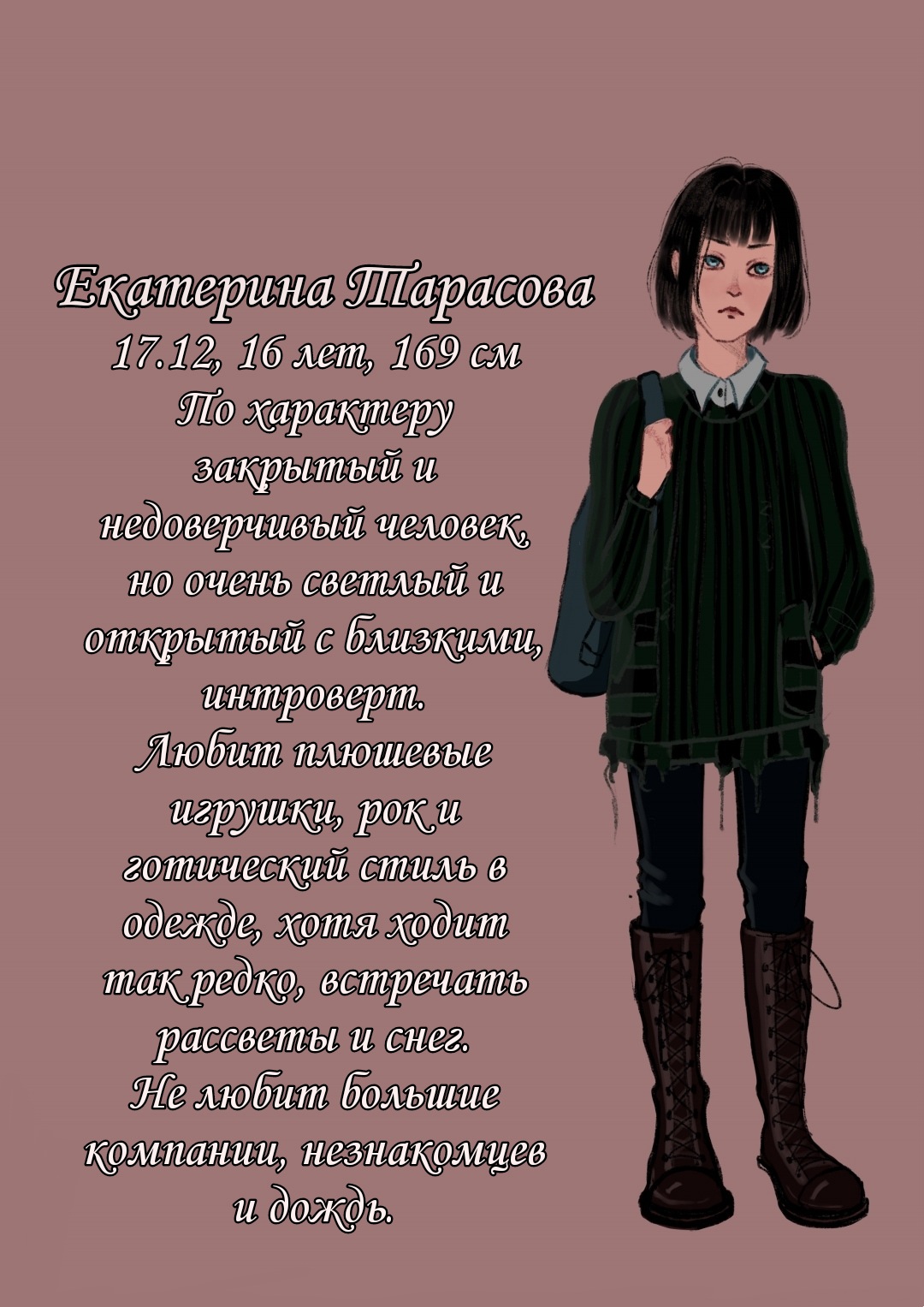 Уже знакомая вам Катя Тарасова оказалась похожа на меня тем, что не общается с другими. Однако причины у нас совершенно разные: осознав всю бренность этого мира, девушка отказалась от любого контакта с людьми, ведь, по её мнению, он не приносит ни счастья, ни удовольствия. Но знаете, я думаю, что всё-таки когда-то мы были похожи. Она тоже любила людей, тянулась к ним, но люди от неё отвернулись, будто летучие мыши спрятались днём от солнца.