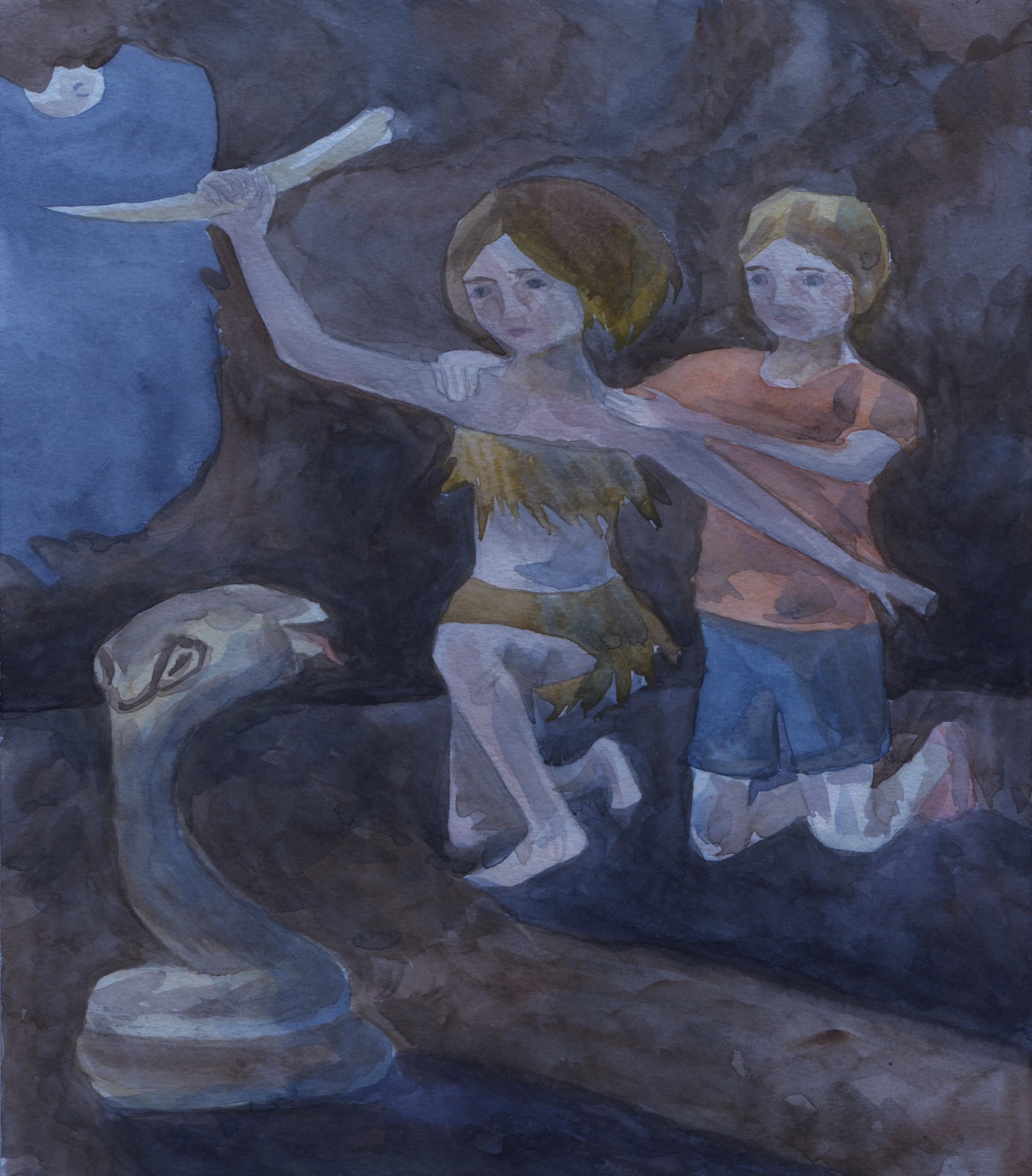 – Это дерево называется баобаб. Он живёт тыщу лет. А дыра в дереве называется дупло. В таких дуплах могут жить очень страшные звери и насекомые, – объяснила Кыр-Кыр. Только она это промолвила, как совсем рядом послышалось шипенье, похожее на звук закипающего чайника. Кыр-Кыр насторожилась. Её зелёные глаза вдруг зажглись ярким огнём, как у кошки. Свет из глаз осветил дупло, в котором прятались дети, и мальчик увидел, что к ним ползет змея. Да ещё какая! Такую огромную и толстую змею он не видел никогда, даже в зоопарке…