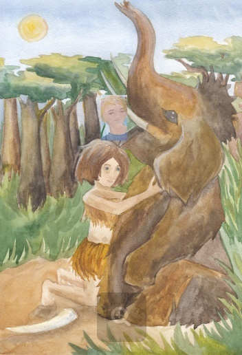 На противоположном берегу реки мальчик увидал огромных зверей с невероятно длинными клыками. Звери были похожи на слонов, которых он видел в зоопарке. Но эти звери были намного крупнее слонов, и они злобно, а не дружелюбно, как слоны, наблюдали за детьми своими маленькими глазками. Гриша хотел подойти поближе. Но тут один зверь высоко поднял клыки и пошёл прямо на детей. Кыр-Кыр вырвала у Гриши кость и, как палку, подняла её высоко, отбиваясь от зверя. Но зверь не отступал. Он приближался быстро, тяжело наступая, и уже почти касался своим клыком мальчика. Гриша закричал от страха. Но в этот момент Кыр-Кыр ловко ударила зверя костью по клыку, и тот истошно зарычал. Ему, конечно же было больно! Другие, такие же огромные звери услышали жалобный стон своего товарища и двинулись ему на помощь. Стадо огромных зверей направлялось к детям. Кыр-Кыр крикнула: – Держись за мою кость!