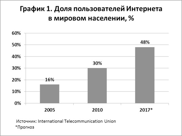Сегодня ни у кого не вызывает сомнений, что мир и его экономическая организация за последние два десятилетия претерпели кардинальную перестройку. Взрывной рост новых технологий, компьютеризация, цифровизация и ускорение обмена информацией оказали мощнейшее влияние на все сферы деятельности человека в общем и сферу коммуникаций в частности. Изменение характера коммуникации в социальной и экономической жизни стало центральным элементом наиболее важных процессов эволюции человеческого общества. Это неудивительно, так как сознательная коммуникация всегда была отличительной характеристикой человека как вида. Получив доступ к новым средствам коммуникации, связывающим социальные группы, информационные пространства, финансовые и товарные рынки в единое целое, человек стал непосредственным участником макропроцессов, к которым ранее не имел прямого доступа. Всемирная сеть открыла эту возможность для большей части населения земли. При этом за относительно короткий (по историческим меркам) отрезок времени в Интернете сформировался новый рынок труда, производства и потребления, а виртуальность стала неотъемлемой частью повседневной жизни миллиардов людей (График 1).