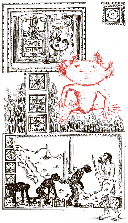 Аксолотль – это саламандра, один из около 500 сохранившихся в природе ее видов. Тысячелетиями люди считали, что саламандры имеют некую особую связь с огнем. В Бестиарии Эшмола, иллюстрированной книге о животных, написанной в Англии в эпоху раннего Средневековья, говорится: «Саламандра живет в огне, не чувствуя боли и не сгорая; саламандра не только не горит, но и может тушить огонь».