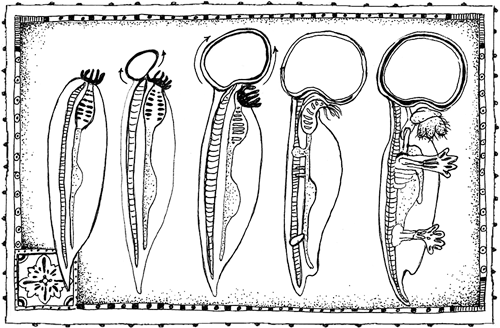Гипотеза Джонса с самого своего появления вряд ли могла кого-то убедить – жаль, конечно, учитывая, какие долгопяты милые. Но еще более невероятную гипотезу предложил Франсуа де Сарр: он утверждал, что двуногие человекоподобные существа появились не только раньше обезьян, но и до всех других видов четвероногих животных (то есть всех обитающих на суше позвоночных животных: земноводных, рептилий, млекопитающих и птиц) и даже рыб. И этот гомункул, считал де Сарр, развился непосредственно из водного «допозвоночного существа», наподобие ланцетника (сохранившегося до настоящего времени животного, напоминающего маленькую рыбку, с хордой, но без мозга или позвоночника). Получается, что человек сохранил самую древнюю из когда-либо существовавших форм туловища позвоночных, а все остальные – стегозавры, змеи, саламандры, коровы, капибары и коати – эволюционировали из человека. Мы – тот архетип, из которого возникли все позвоночные.