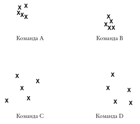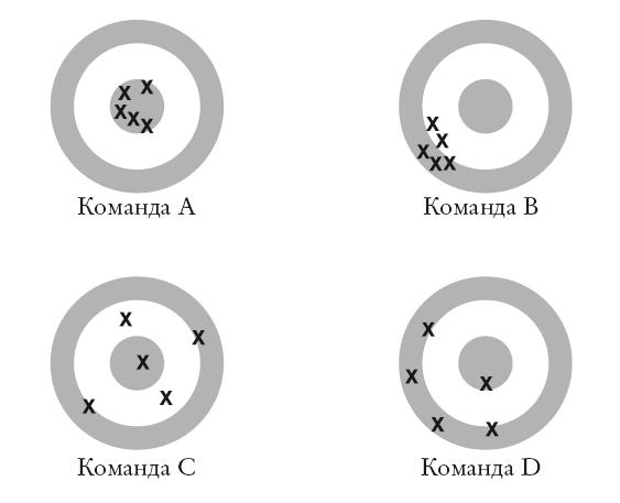 У команды А почти так и вышло: все попадания сгруппировались возле цели.