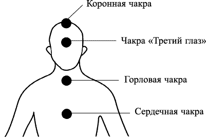 Схема, приведенная ниже, иллюстрирует положение четырех наиболее важных чакр (или внутренних энергетических центров). Именно эти четыре верхние чакры наиболее тесно вовлечены в работу с ангелами.
