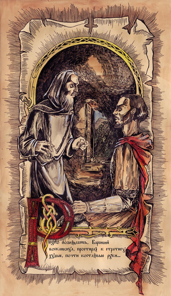 Вечером третьего июня одиннадцатого индикта, когда красноватое солнце уже садилось, уступая место долгожданной прохладе, монах Варсисий, совершив обычное молитвенное правило, покинул келью: его хижина из обмазанного глиной тростника была тесна и темновата, и в теплую пору отшельник чаще проводил время снаружи, под хлипким навесом. Оглядев пересохшие грядки с чахлыми листьями свеклы, бобов и сельдерея, Варсисий вздохнул и вышел за покосившийся плетень. Ясный безоблачный закат говорил о том, что жара вряд ли спадет в ближайшие дни, – а значит, дождей не стоило ждать до самых июльских календ. Вдали, на пологом склоне холма, на вершине которого стояла Филомилийская крепость, возле белых домиков копошились земледельцы. Сощурившись, Варсисий поглядел на вившуюся в долине дорогу, ожидая, впрочем, что она будет пуста и безлюдна, – путники редко посещали Филомилий. Однако на дороге виднелось облако пыли: оно быстро приближалось, и вскоре монах различил четырех всадников, которые свернули не в сторону крепости, а на тропу, ведшую к хижине Варсисия. Отшельник на всякий случай ретировался под защиту своей убогой изгороди и скрылся в хижине, но вскоре услышал снаружи знакомый голос: