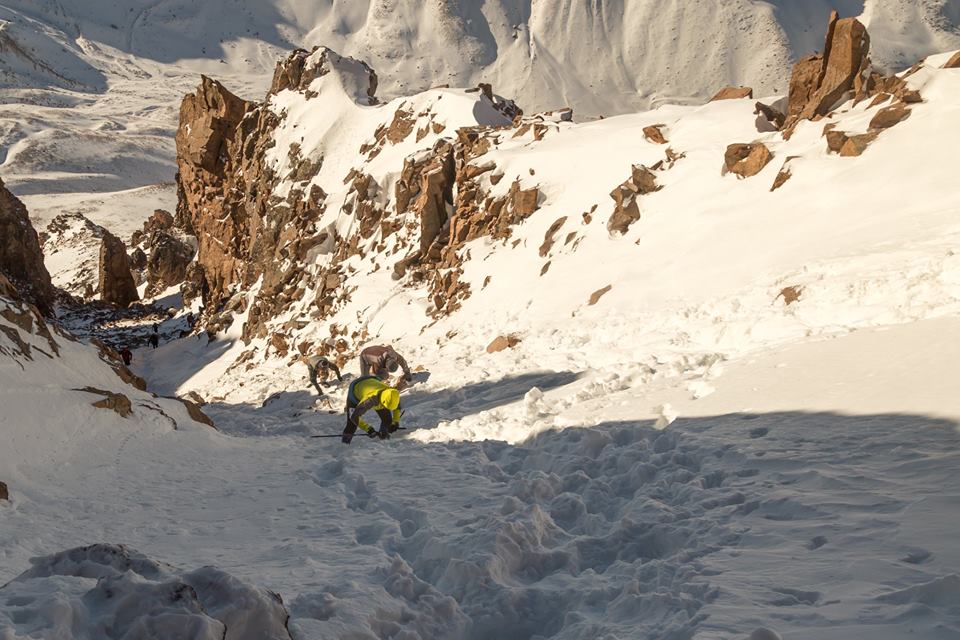 Слышу, как кто-то советует не бросать палки. Ладно. пытаюсь карабкаться с ними, но уже спустя 10 метров понимаю, что для этого нужно дополнительно еще руки 4 как минимум, но у меня их всего две. Очень вовремя вниз идет Магжан, которому я отдаю ильясовские палки и прошу, чтобы оставил их внизу. Далее передвигаюсь так. Сзади все так же движется Ербол.