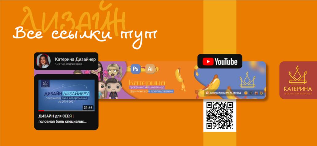 С 2016 года преподаю программы Adobe-пакета (Ai, Ph, InD) и Corel Draw (да, на нём ещё работают :D), основы дизайна «с нуля». А также веду свой YouTube накал «Катерина Дизайнер», где есть бесплатные и доступные видеоуроки, видео для вдохновения и влоги фрилансера. Если для вас это интересно – буду рада видеть на своем канале!
