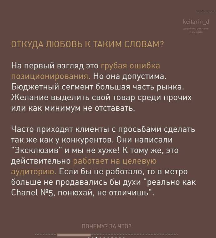 Клиент относится к необходимости создать определенного толка макет по дизайну и тексту не так чувствительно, как специалист. Он видит конкурентный ряд и часто не понимает почему нужно написать так же как они, но непременно думает, что отставать нельзя. Главное, чтобы больше покупали и чётче видели.