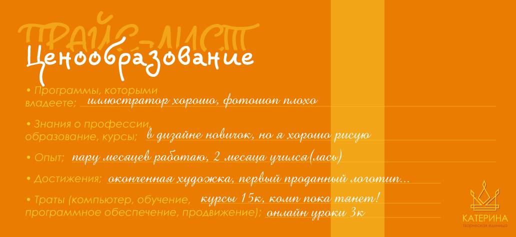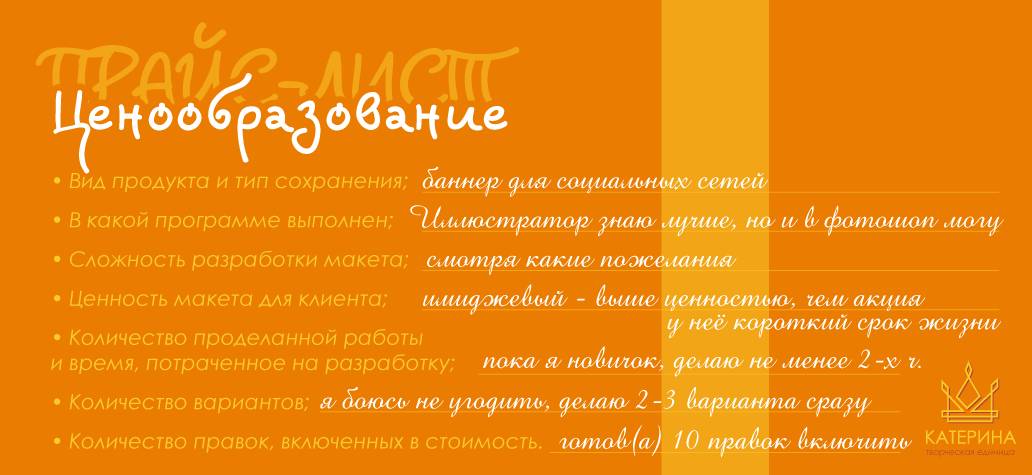 Прайс фрилансера необходимо иметь в свободном доступе с базовой целью – проинформировать о предоставляемых услугах. Поэтому рекомендую сделать макеты с подробным или интригующим описанием (если хочется иметь возможность корректировать цены по своему усмотрению в зависимости от клиента).