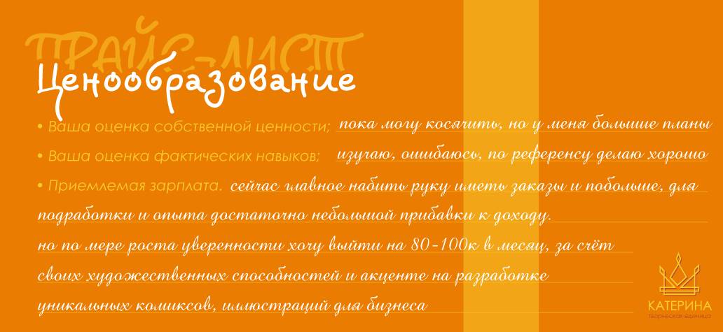 Вы можете жить в Сызрани, поставить цель – зарабатывать не меньше 30 000 рублей и вполне здорово себе жить. Расписать норму по желаемому количеству клиентов, примерную цену на каждую позицию и тестировать разные варианты. Отслеживать внутренний комфорт, приходящих клиентов и качество коммуникации между вами. По ходу приобретения опыта редактировать свои представления о стоимости того или иного макета.