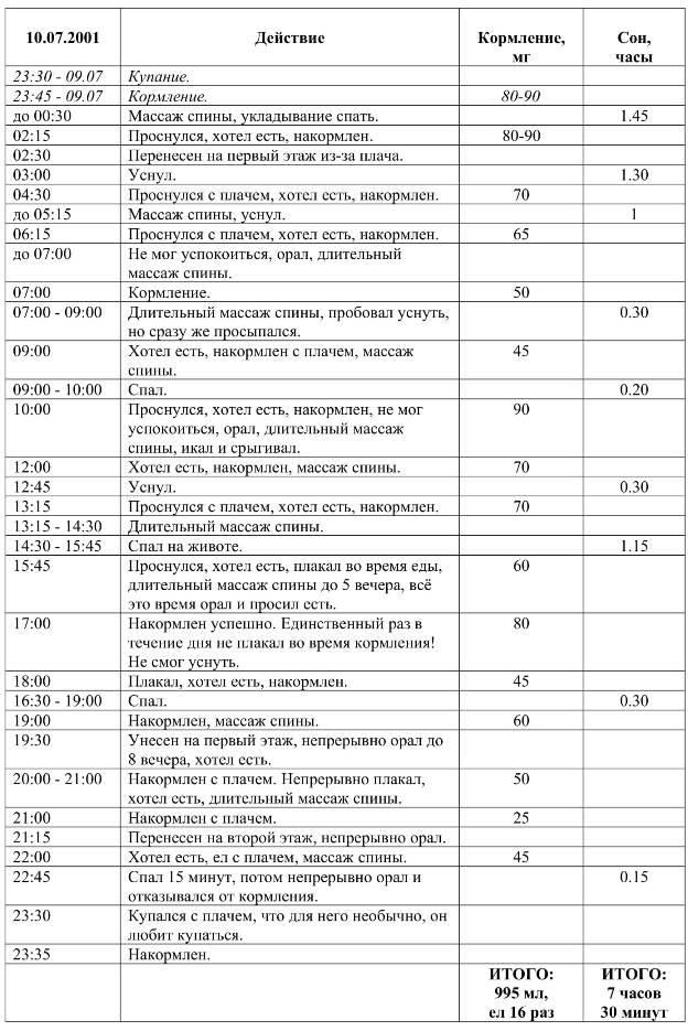 В какой-то момент я поняла, что никто не готов воспринимать наши проблемы всерьёз, и нужно сделать что-то радикальное. Я начала снимать ребёнка на видео и создала файл, куда вносила всё происходящее, в течение 10 дней, в хронологическом порядке. Затем я снова посетила главврача нашей поликлиники и принесла ему подробную "таблицу жизни". Ниже – пример нашего обычного дня.