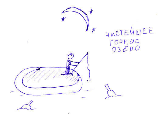Шли несколько часов. Мимо зеленеющих садов и недоверчивых сторожей. К озеру прибыли в сумерках. При ближайшем рассмотрении оно оказалось совсем не горным и абсолютно не чистым. При мысли, что лодку спустят на воду, возникало легкое чувство брезгливости, перерастающее в протест. Обещанная сочная трава была вытоптана. Какая ж грязь! Спасибо, хозяйское одеяло пригодилось!