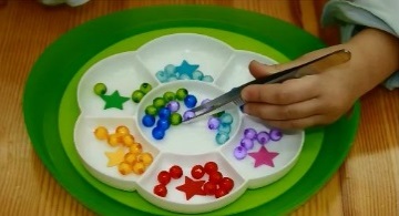 Очень важно уделить внимание «пинцетному захвату». Пока ребёнок маленький, пальцы у него плохо развиты, и он хватает рукой, кистью, ладонью. И только потом постепенно возникает этот «пинцетный захват». «Давай возьмём аккуратненько каждую бусинку, каждую горошинку» – просто обращайте внимание. Не надо заставлять, если не получается это – показывайте, как Вы это делаете с интересом: «Вот смотри, у меня пальчики оп – взяли, оп – положили» – чем больше Вы будете играть интонационно, тем больше шансов увлечь ребёнка.