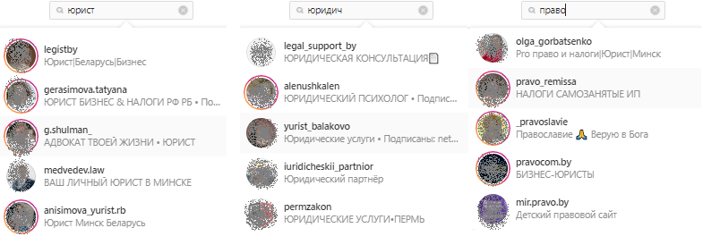 Самый очевидный способ – использовать встроенный поиск в социальной сети. Если вы ищете блогера-юриста, логичнее всего так и написать – «юрист». Но попробуйте поставить себя на место того самого юриста и подумать, какие ещё формулировки он может использовать: «юридические услуги», «адвокат», «право».