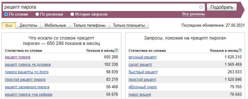 Чтобы понять, какие запросы вводить, можно использовать сервис подбора слов от «Яндекс. Подбор слов». Пишете один из запросов, и «Яндекс» подсказывает, какие ещё формулировки люди используют (правый столбец на скриншоте ниже). Если ввести «рецепт пирога», то видно, что те же люди также часто ищут «яблочный пирог», «быстрый рецепт», «салат рецепт».