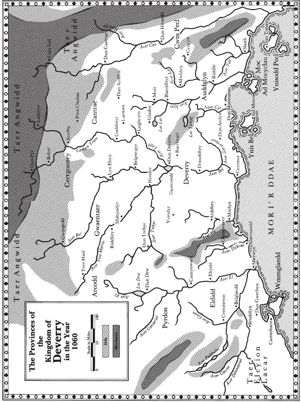 Back in the eleventh century, when the far-flung kingdom of Deverry lay sparse and tentative across the lands men claimed in the king’s name, Eldidd province was one of the most sparsely settled areas of all. Particularly in its western reaches, towns were rare, and in the west Dun Gwerbyn was something of a governmental seat, even though its high stone walls circled barely five hundred thatched houses and three temples, two of those little better than wayside shrines. On a hill in the center of town, however, stood the dun, or fort, of the tieryn, large and solid enough to be impressive in any province at that time. Inside a double set of earthworks and ditches, stone walls sheltered stables and barracks for the tieryn’s war band of a hundred men, a collection of huts and storage sheds, and the broch complex itself, a four-story round stone tower with two shorter towers built on to the sides.