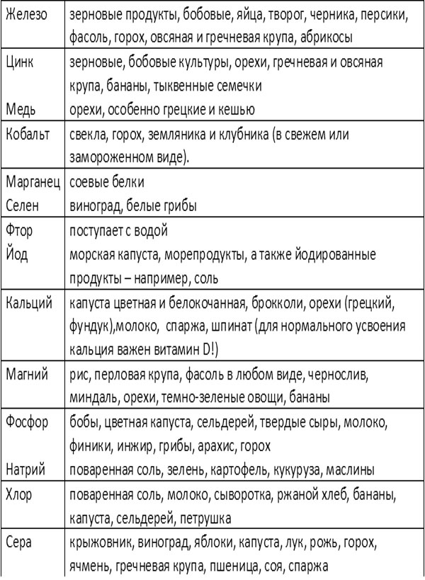 Ознакомьтесь с краткой таблицей, в которой указано, из каких продуктов можно взять необходимые витамины, а также минералы.