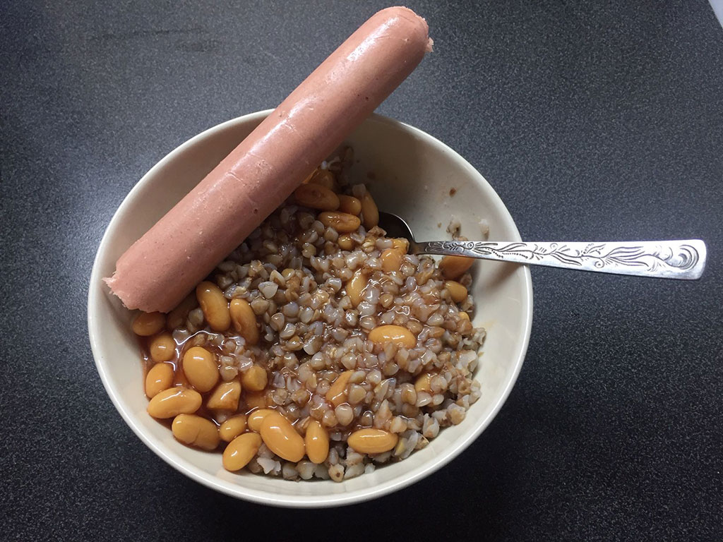 Гречневая каша с фасолью, ложкой томатной пасты и вегетарианской сосиской.