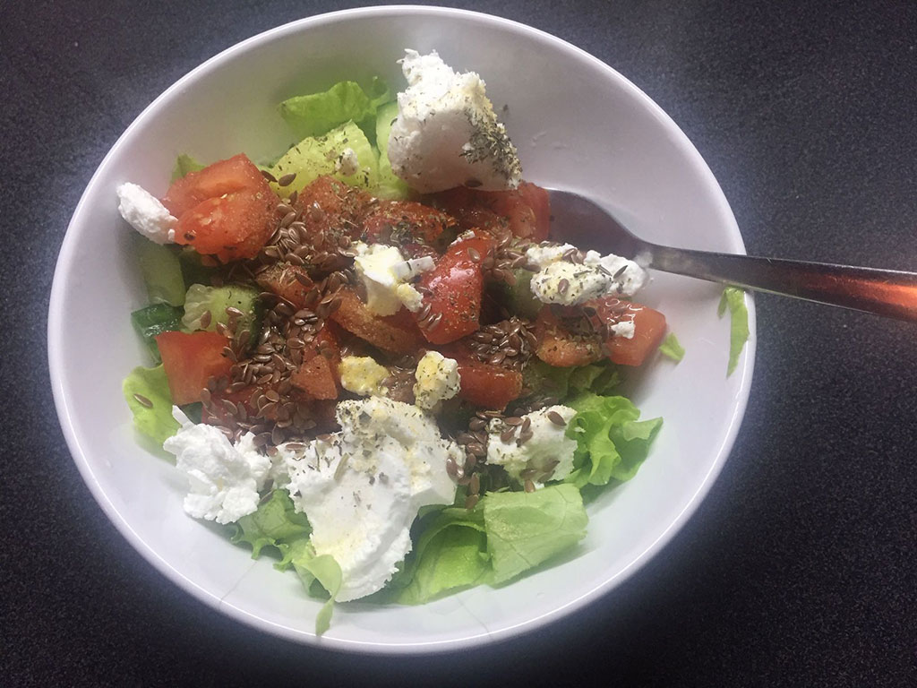 Салат: листья салата, огурец, помидор, брынза, специи, семя льна, льняное масло.
