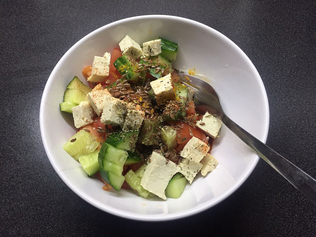 Салат из огурцов, помидор, тофу, специй, льняного семени и льняного масла.