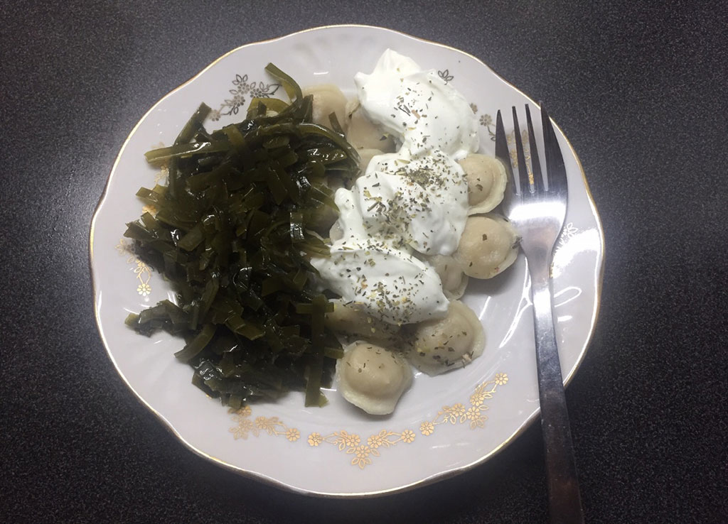 Вегетарианские пельмени с греческим йогуртом и морской капустой.