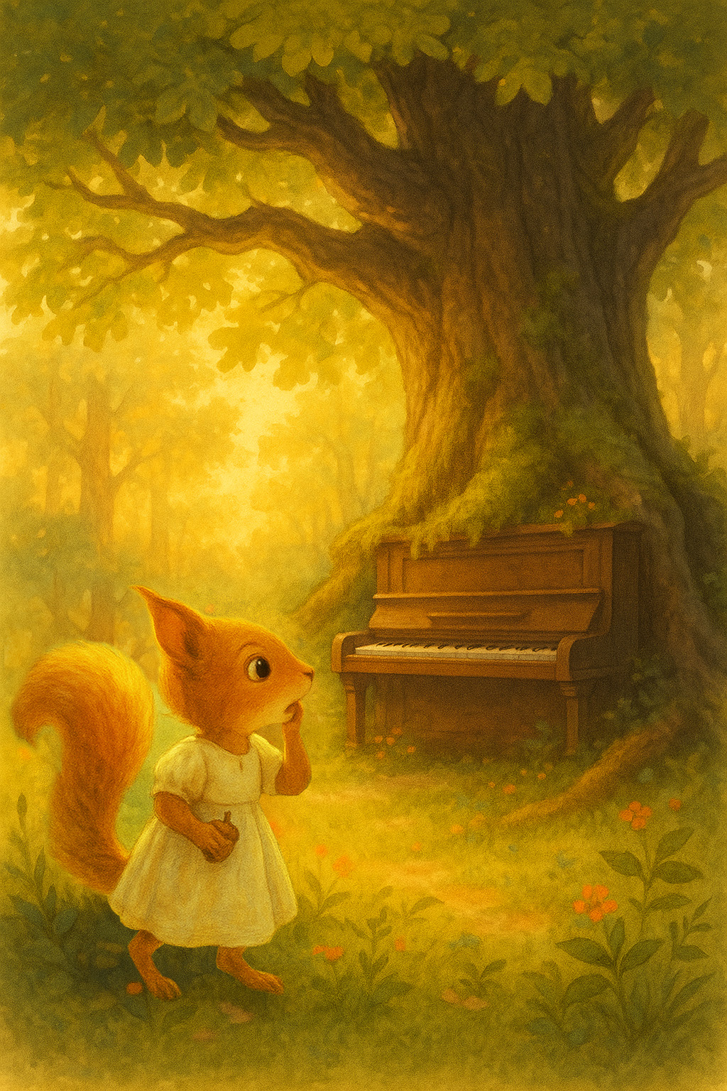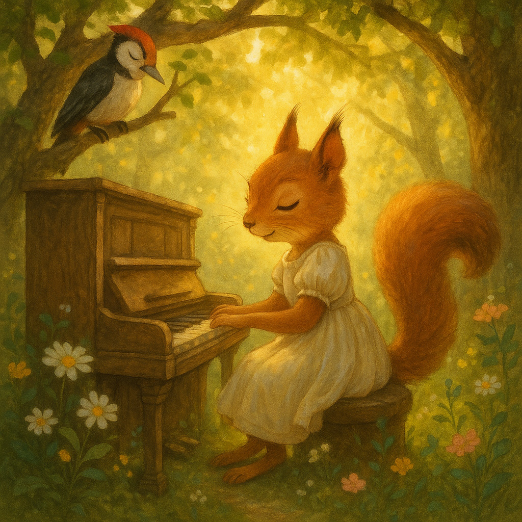 Каждое утро белочка Мира прибегала к Лесному фортепиано. Она больше не искала жёлуди, не прыгала по кронам – её сердце теперь звало только к одному: к звукам.