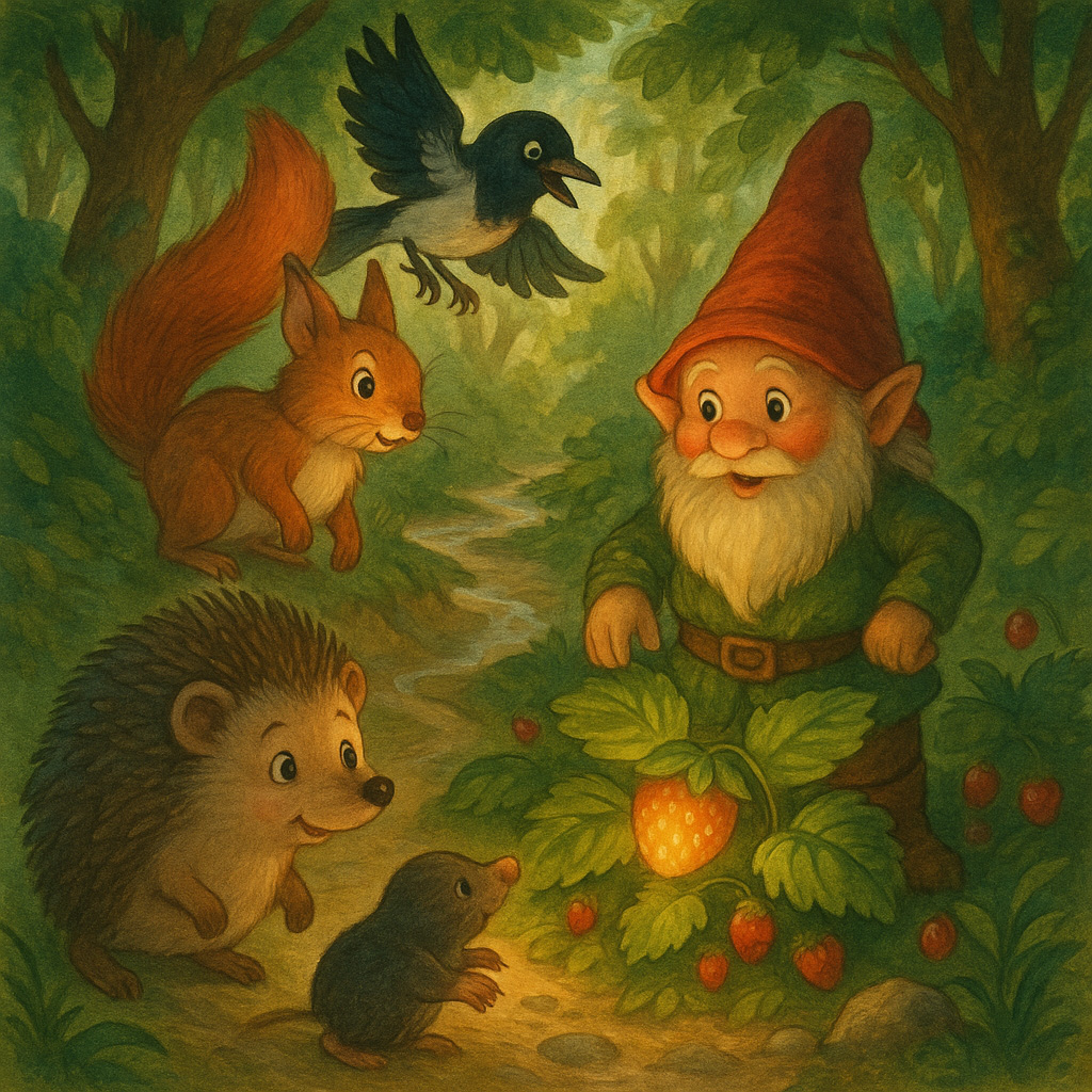 И, словно по волшебству, гномик отошёл в сторону, и друзья увидели: перед ними раскинулась клубничная поляна. Сочная, яркая, залитая солнечным светом. Ягоды так и звали: "Собери нас!"