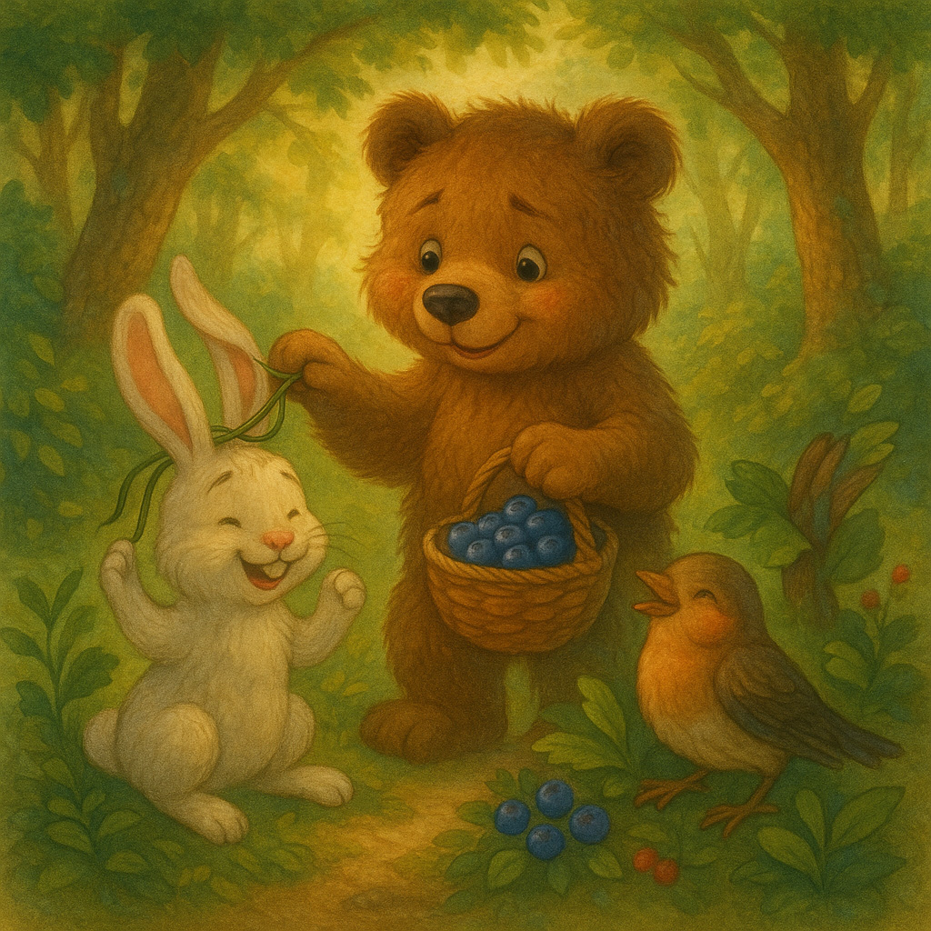Лес был прохладный и влажный от ночной росы. Листья шептали что-то друг другу, а птицы щебетали утренние мелодии. Боня знал: самая сладкая голубика растёт на дальнем склоне леса, за лужайкой с колокольчиками.