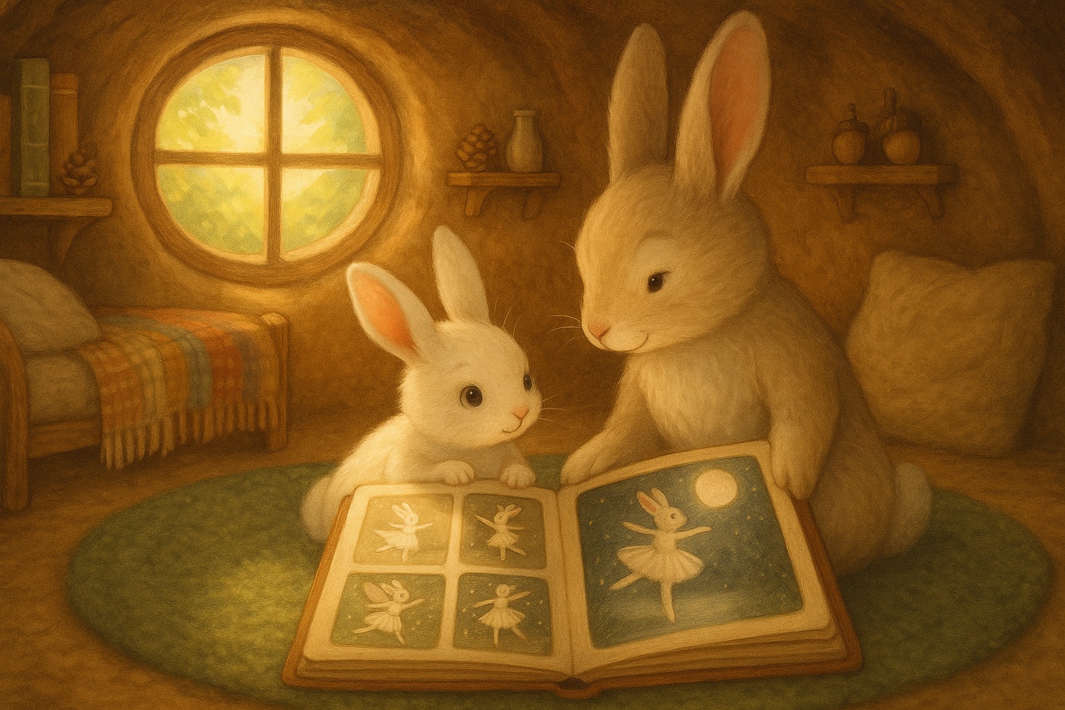 На фотографии мама была совсем юной зайкой, застенчиво улыбающейся, с ушами, заплетёнными в пучок. Вокруг неё другие балерины – белки, ежата, мышки. А за ними – сцена из коры, украшенная грибными фонариками.