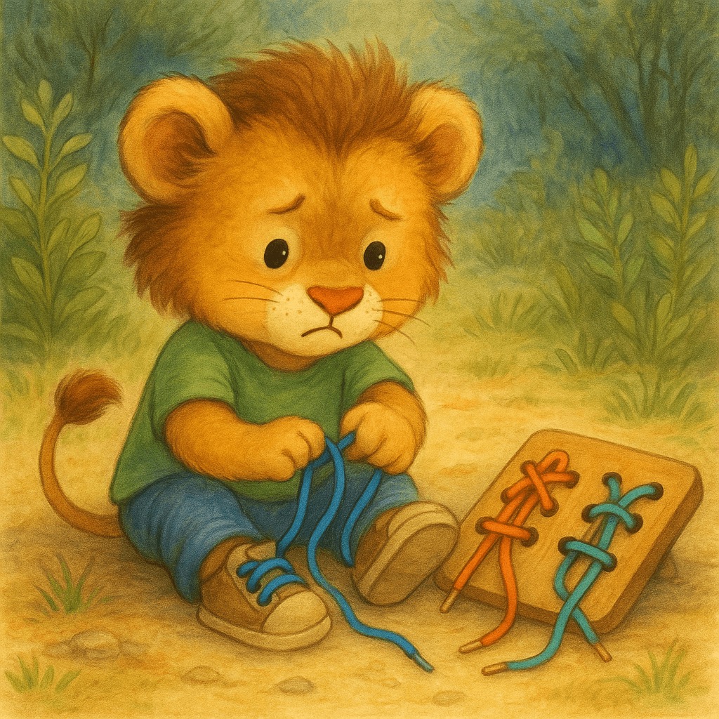 Маленький львёнок Рик был от природы очень ловким – он быстро бегал, умел перепрыгивать через ручейки и забирался на деревья. Но была одна вещь, с которой он никак не мог справиться: шнурки на его новых ботинках.