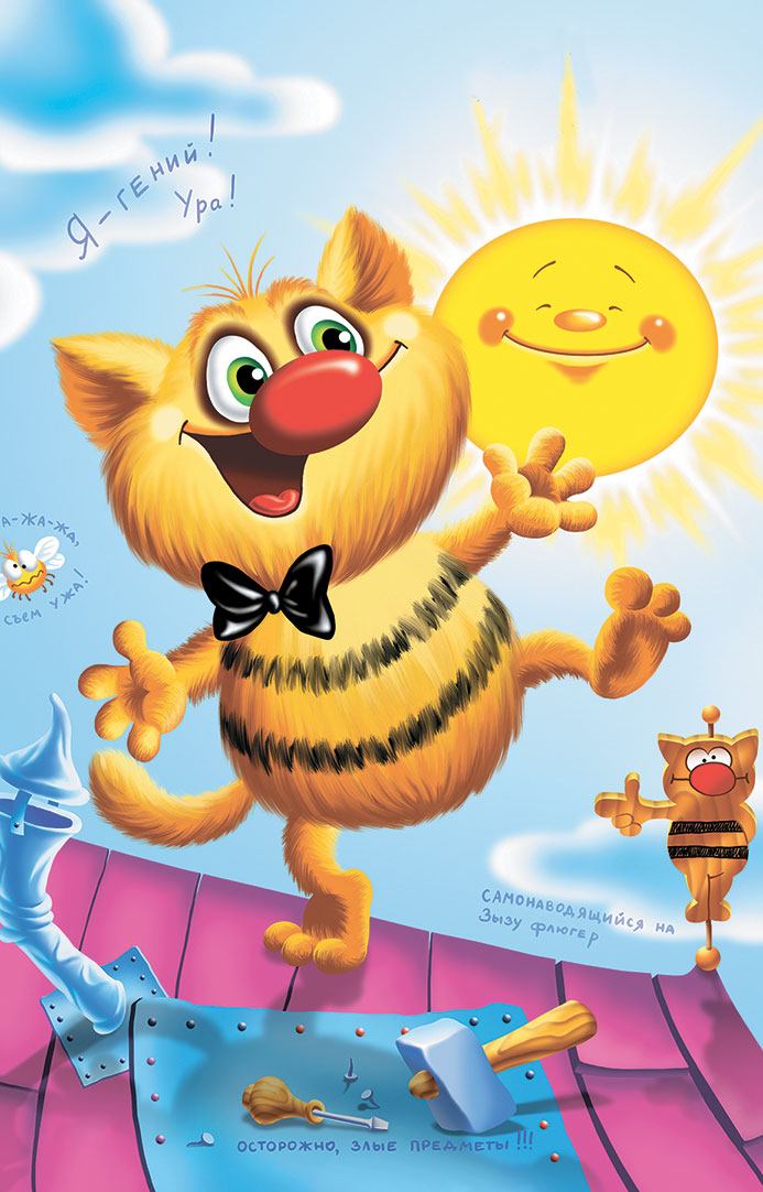 А заодно кот сделал несколько изобретений: самополивающую лейку, которая стояла посередине клумбы, разбрызгивая воду на цветы; суперкарусель, которая двигалась не только по кругу, а ещё и по квадрату. А также установил на крыше флюгер в виде кота с вытянутой лапой. «С помощью этого флюгера мы будем точно знать, откуда и куда дует ветер! В прямом и переносном смысле», – объяснил кот.