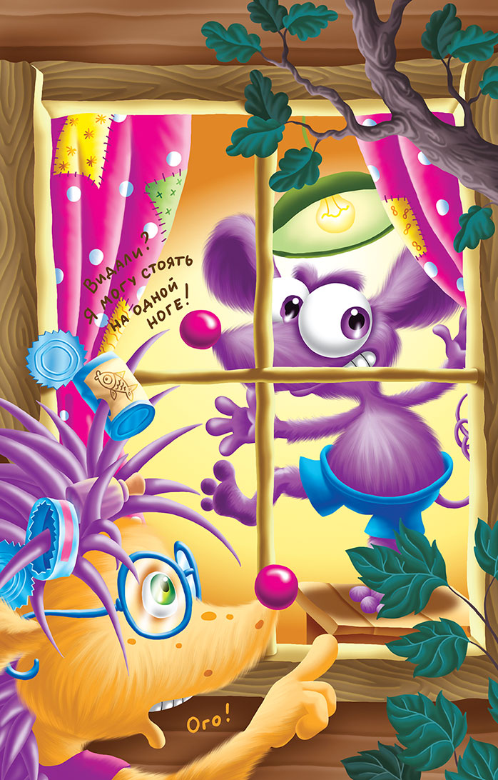 В комнату ввалились суслик Шмутц и певец-скворец Дзынь. Запнувшись за порог, они повалились друг на друга. Тут же в дверном проёме показалась сова Угуха. Нисколько не смутившись, она прошлась по спине Шмутца и, потоптавшись на Дзыне, спрыгнула на пол.