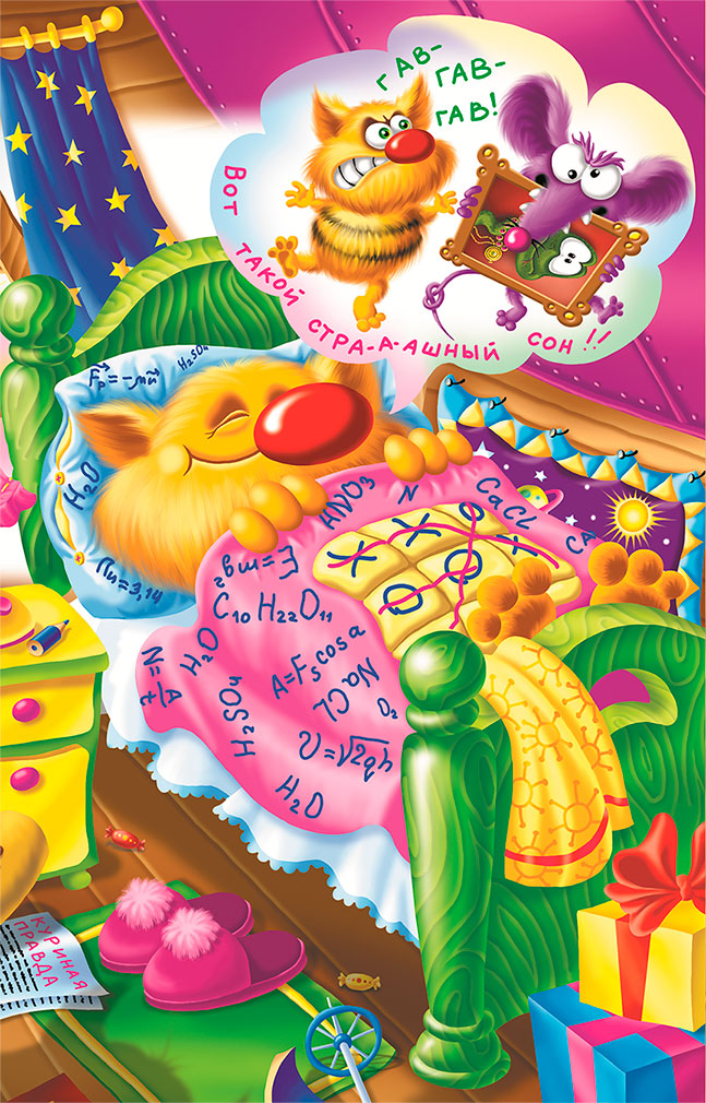 Несколько секунд он лежал с открытыми глазами, уставившись в потолок, потом шмыгнул носом и выплюнул кусок одеяла. Рядом не было ни Зызы, ни картины. Всё как вчера: чердак, где уже целую неделю жил гениальный кот, и творческий беспорядок. На стенах висели фотографии с его любимыми мышатами, письма от друзей в рамочках, а также награды, памятные сувениры и воздушные шарики. Но что-то всё равно изменилось. Звук, с которым Зыза грыз картину, не растаял вместе со сном, а остался и, казалось, даже усилился.