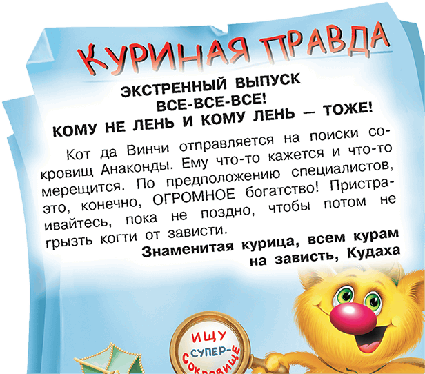 – Так вот, недавно эта газета расширилась. Курица Кудаха сколотила себе курятник, стала главным редактором, но её единственный журналист исчез на секретном задании, разыскивая сокровища Анаконды.