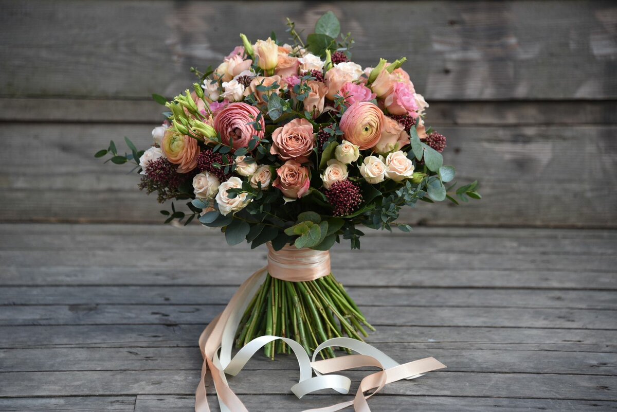 – Терпимость без воды. Частый критерий в выборе невесты, чтобы сохранить вид букета как можно дольше. При таком подходе предлагайте самые устойчивые цветы: гвоздики, гипсофилу, крепкие розы в плотном бутоне, ранункулюсы, ягоды, сухоцветы и другие.
