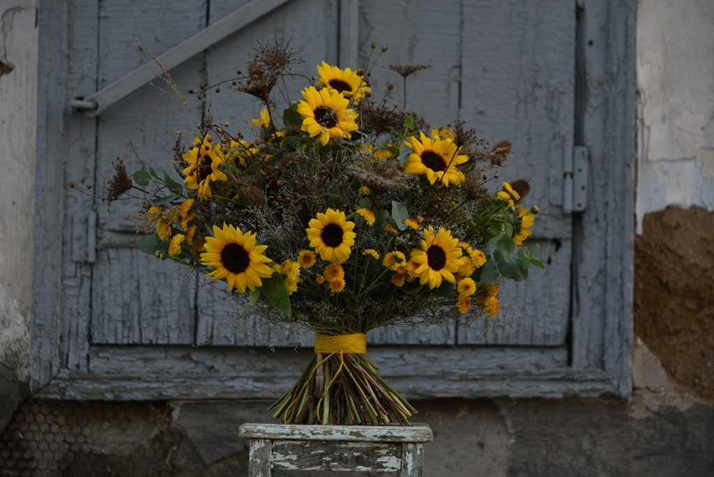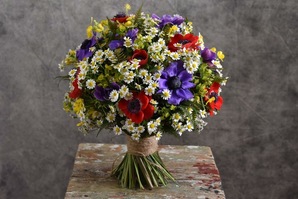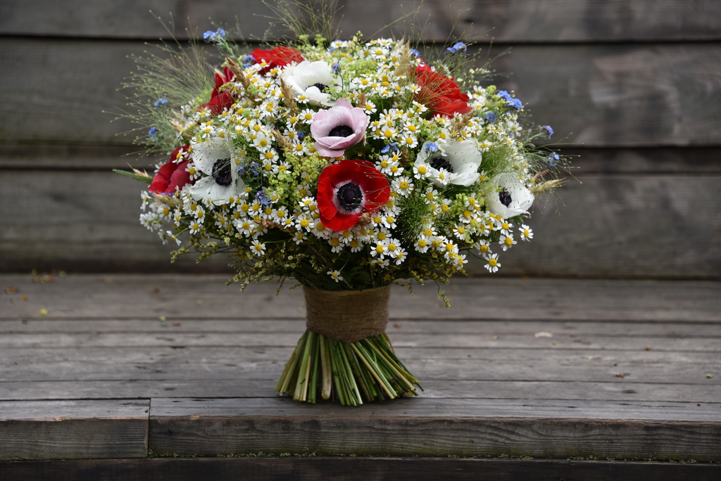 Русский полевой, рустикальный, деревенский. Букет из полевых цветов и трав с большим количеством тонких стеблей преимущественно из мелколепестных цветов. Собирается чередованием, отличается тщательной подготовкой цветов перед сборкой.