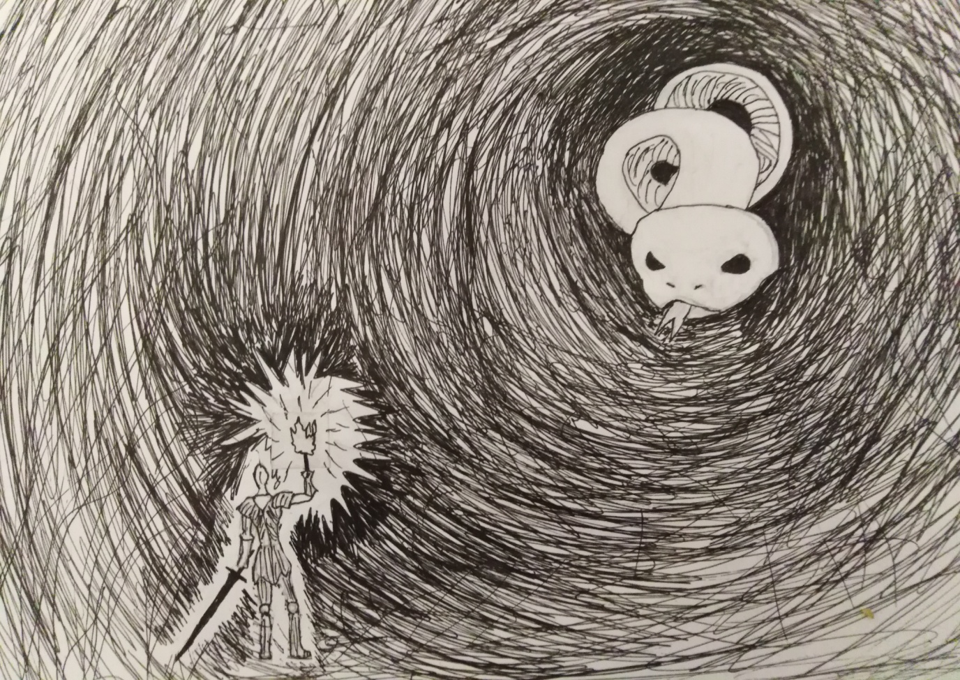В начале времён, ужасный змей Урсаэль, изнывая от голода, захотел поглотить сердце Мира, дабы насытится и обрести бессмертие. И через тёмную пещеру, пополз в глубины земли. Долго добирался змей. Чем глубже он опускался, тем больший жар ощущал, и разомлев от тепла уснул Урсаэль крепким сном. Время шло, могучие горы и скалы обращались в песок и пыль. Густые зелёные леса сменяли собой бесплодные пустыни, земля менялась. Всё шло своим чередом. Однажды, великий король основал великое королевство, и мудро правил в нём. Подданные любили своего правителя, ибо добр и справедлив тот был, к своему народу, и шумные гуляния во славу короля не затихали никогда. Вскоре сильная дрожь начала сотрясать землю, тем самым разрушая королевство. То было древнее чудовище из старых легенд, змей Урсаэль, ворочавшийся во сне, что знаменовало его скорое пробуждение, и всеобщую погибель Мира. Много храбрых воинов ушло в мрачные глубины, желая убить спящее чудовище, но никто из них так и не вернулся. Пока однажды, странствующий рыцарь по имени Арденас, не прослышал о беде постигшей королевство. То был благородный и сильный воин, в сияющих доспехах доблести из небесного металла, из мерцающих вечностью звёзд упавших на холодную землю, и крепче доспехов не было ни у кого. И спустился отважный рыцарь в тёмную пасть пещеры, желая убить чудовище, как и многие другие до него. Вдруг ужасный рёв поднялся из глубин, снова задрожала земля, и пещера обвалилась, а после наступила тишина.Обрадовались и опечалились жители королевства, ибо поняли они, что одолел отважный рыцарь змея, ценой своей жизни и долгие века помнил народ о великом герое, и его великой жертве.