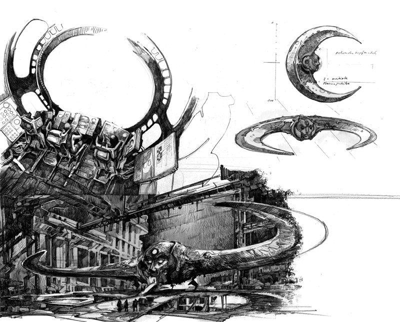 Пока «Кночи» лежала горизонтально, ее серповидная форма не бросалась в глаза, особенно вблизи. Изогнутый корпус, края которого были обращены друг к другу, в самом широком месте достигал восьмидесяти метров в поперечнике, а высота без стоек составляла пятнадцать метров. Командный мостик располагался за огромным стальным лицом, украшавшим середину дуги. Лицо было частью круглой капсулы, которая переворачивалась в зависимости от положения корабля. Поэтому вне зависимости от того, лежала «Кночи» или стояла, глаза всегда располагались параллельно земле. Окно кабины сверкало во лбу, словно третий глаз, а во рту находился вход в трюм.