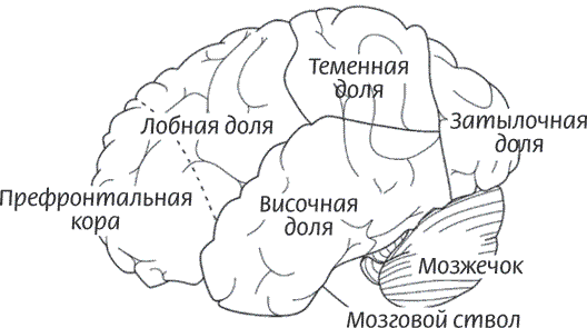 Однако лобная доля больших полушарий отвечает не только за речь. В лобной доле есть передняя часть, называющаяся префронтальной корой головного мозга. Здесь мы найдем нашу личность и способность к планированию действий. Префронтальная кора – самая молодая часть мозга не только с точки зрения эволюции, но и потому, что она развивается у растущего ребенка самой последней.