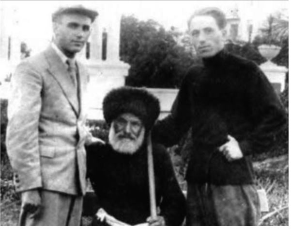 (Soldan sağa) Balkar şairi Kerim Otarov, Kâzim ve Kaysın Kuliev. Nalçik, 1940.