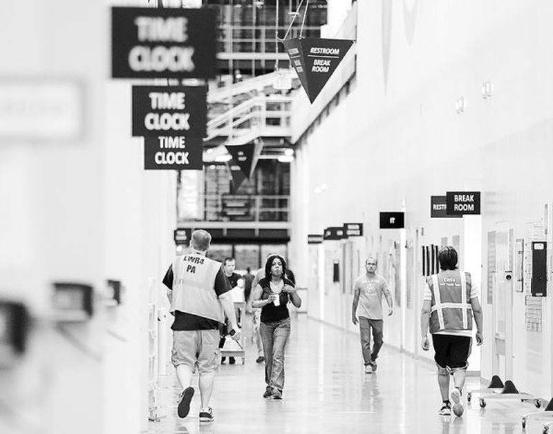 Когда я вхожу в огромный центр компании Amazon в Роббинсвилле, штат Нью-Джерси, первое, что я вижу, – это большой знак с надписью «Табельные часы». Она торчит из одного из ярко-желтых бетонных пилонов, протянувшихся через огромное заводское пространство площадью 1,2 миллиона квадратных футов. Это крупный распределительный склад для небольших объектов – центральный узел распределения на северо-востоке США. Он представляет собой головокружительное зрелище современной логистики и стандартизации, призванной ускорить доставку посылок. Десятки табло с часовым механизмом расположены через равные промежутки времени вдоль входа. Каждая секунда работы контролируется и подсчитывается. Работники, известные как «партнеры», должны регистрироваться сразу же по прибытии. В редких, освещенных флуоресцентным светом комнатах отдыха, также установлены часы и еще больше знаков, подчеркивающих, что все сканирования при входе и выходе из комнат отслеживаются. Как на складе сканируют упаковки, так на складе следят и за максимально возможной эффективностью работников: они могут отрываться от работы только на пятнадцать минут за смену, с неоплачиваемым тридцатиминутным перерывом на обед. Смены длятся по десять часов.