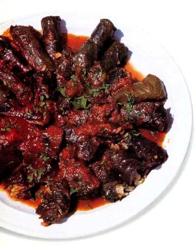 50-60 vine leaves (available in vacuum packs or, if you are lucky, loose in brine from a good specialist food shop) 2 large onions, finely chopped 1 bunch of peppery spring onions, very finely chopped. 1 good bunch of fresh dill, very finely chopped 1 bunch of fresh mint, finely chopped 1½ cups rice, well rinsed, drained and dried olive oil juice of 4 lemons 500ml/18fl oz tomato passata sea salt and black pepper lemon wedges, to serveBlanch the vine leaves a few at a time in lightly salted boiling water, then cool them in a bowl of cold water. Drain and lay out flat on a work surface.