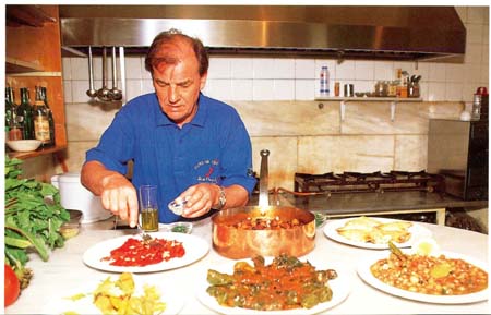 The journey to Corfu, our first destination in Greece, was miserable. We got to Malaga airport at about 7am with two huge tin trunks full of all my cooking equipment, only to find we had to pay about £700 in excess baggage. Then we discovered that the trunks could not be booked through to Corfu because we had to fly from Malaga to Madrid, Madrid to Athens and Athens to Corfu, and there were no porters in Malaga or Madrid. If we had had to unload the trunks we could not possibly have shifted them. It took four of us to get them on the plane in the first place. However, we finally made it to Corfu at about 1 o’clock the next morning, the Greek Orthodox Easter Saturday, only to find that it was absolutely freezing. We had expected weather similar to Spain and had packed accordingly. To make matters worse we were checked into the most appalling excuse for a hotel I have ever seen in my life. It had no bar, no lift, no lights, the lavatory ran incessantly, the taps dripped and the beds were slatted wooden affairs with thin sponge mattresses. There were no power points, no services or facilities of any kind, except for a breakfast of stale bread and jam plus dreadful coffee made from ground roasted acorns. I can tell you we were feeling very sorry for ourselves, and to make matters worse everybody in the pub before we left had said, ‘Oh, you don’t want to go to Corfu, it’s full of lager louts!’ I was very much in mind of Bob Dylan’s song, ‘You’re lost in worries, it’s raining and it’s Eastertime too.’