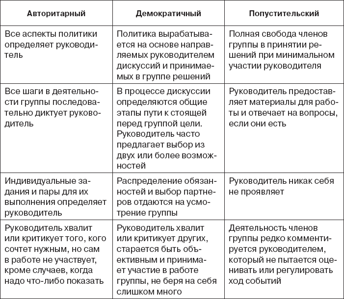 Классические исследования стилей руководства в малых группах были проведены Левином, Липпиттом и Уайтом (Lewin, Lippitt, and White, 1939). Они выделили авторитарный, демократичный и попустительский стили и соотнесли их с продуктивностью работы групп при решении задач и с удовлетворенностью участников опытом их пребывания в группах. Авторитарные руководители единолично определяют и направляют политику группы, демократичные руководители формируют политику через ее обсуждение в группе, попустительски настроенные руководители делегируют свои властные полномочия членам группы, а свою роль в определении политики сводят к минимуму. Эти различия подробнее раскрываются в табл. 1.3. Результаты исследований не оставляют сомнений в том, что демократичные руководители пользуются большим успехом, нежели авторитарные, которые могут подавлять индивидуальную волю участников группы, и попустительствующие, которые никак не ограничивают и не направляют членов группы. Кроме того, демократичный стиль руководства (а также и авторитарный) ассоциируется с более высокими достижениями в нетерапевтических группах (Nixon, 1979). Стили руководства в терапевтических группах также можно рассматривать в диапазоне от попустительского, с доминированием рядовых членов группы и низкой организованностью, до автократического, с доминированием руководителя и высокой организованностью. Вообще центрированная на руководителе ориентация группы обычно связана с более четкой структурной организацией работы группы.