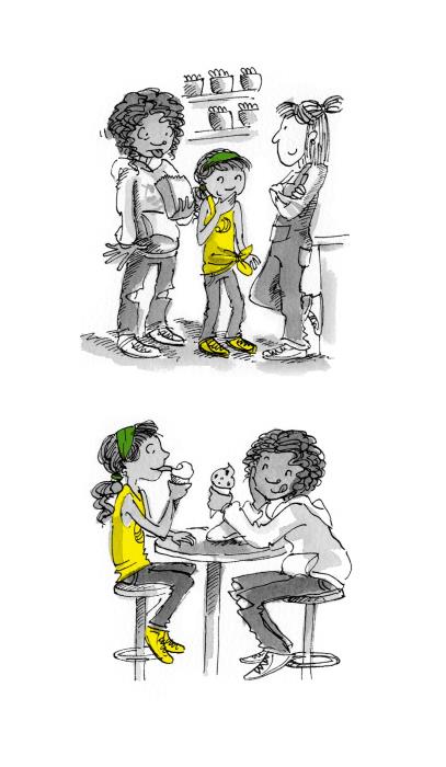 И мы пошли в кафе. Оно было маленькое, и там всё было выкрашено в цвета мороженого: мятно-зелёные столики и неаполитанские стулья, ванильного цвета лампы, похожие на шарики мороженого, и белая леди в радужном фартуке цветов щербета.
