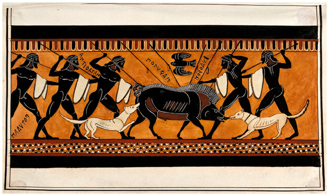 Группа мужчин с копьями и собаками, охотящихся на дикого кабана. Wellcome Collection (Public Domain)