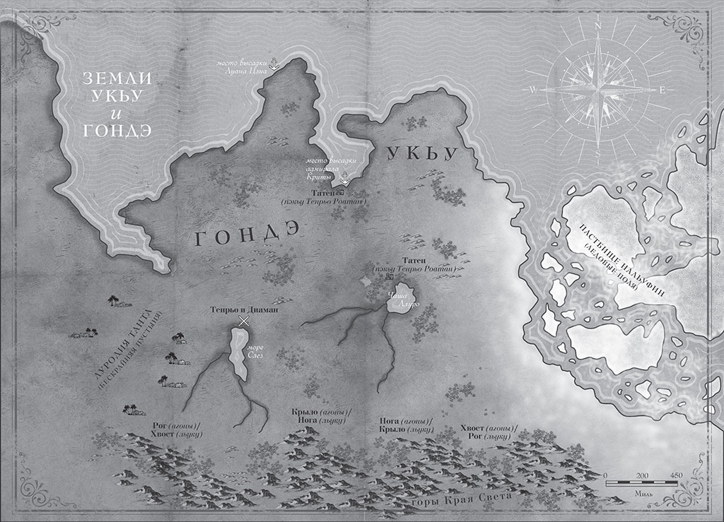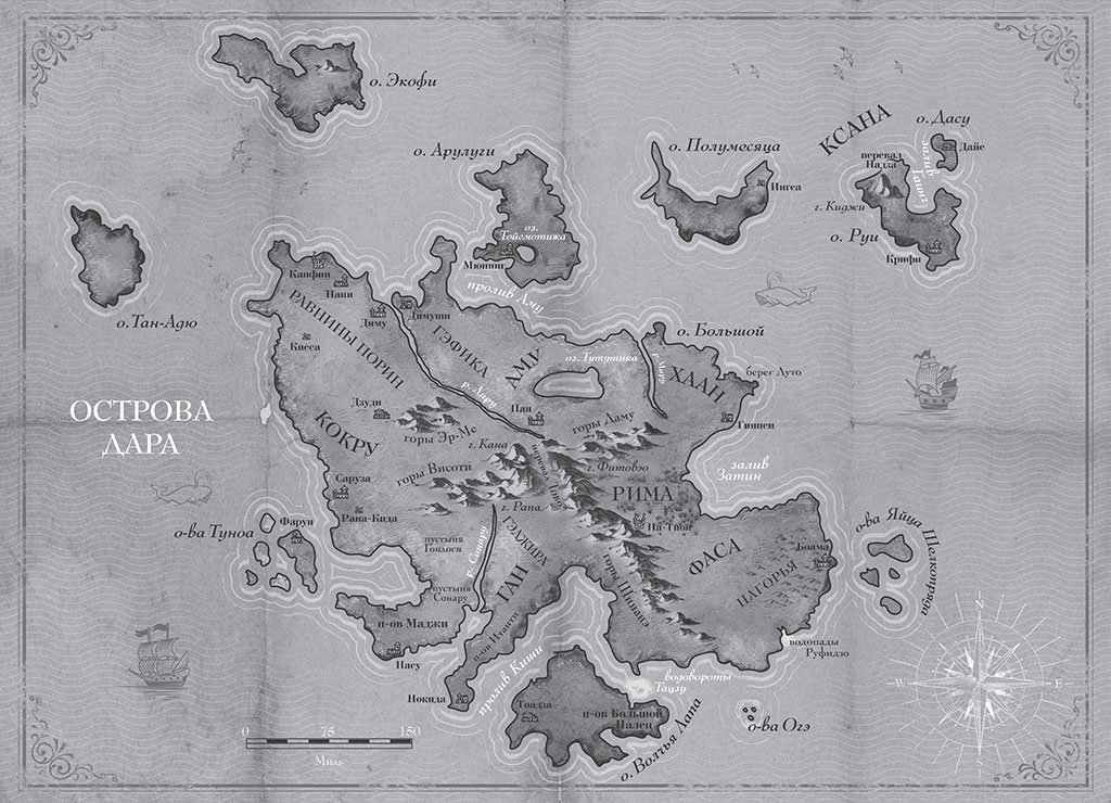 Многие имена собственные на языке дара взяты из классического ано. В данной книге при транслитерации двойные гласные не сдваиваются, а каждая произносится раздельно: например, в слове «Réfiroa» четыре слога – ре-фи-ро-а; а в «Na-aroénna» пять слогов – на-а-ро-эн-на. Звук «и» всегда произносится кратко; «о» – как обычное «о»; «ü» с двумя точками наверху аналогична умляуту в немецком языке или в системе транскрипции китайских иероглифов пиньинь.